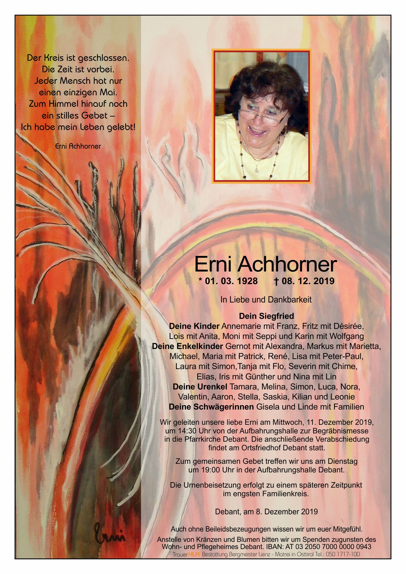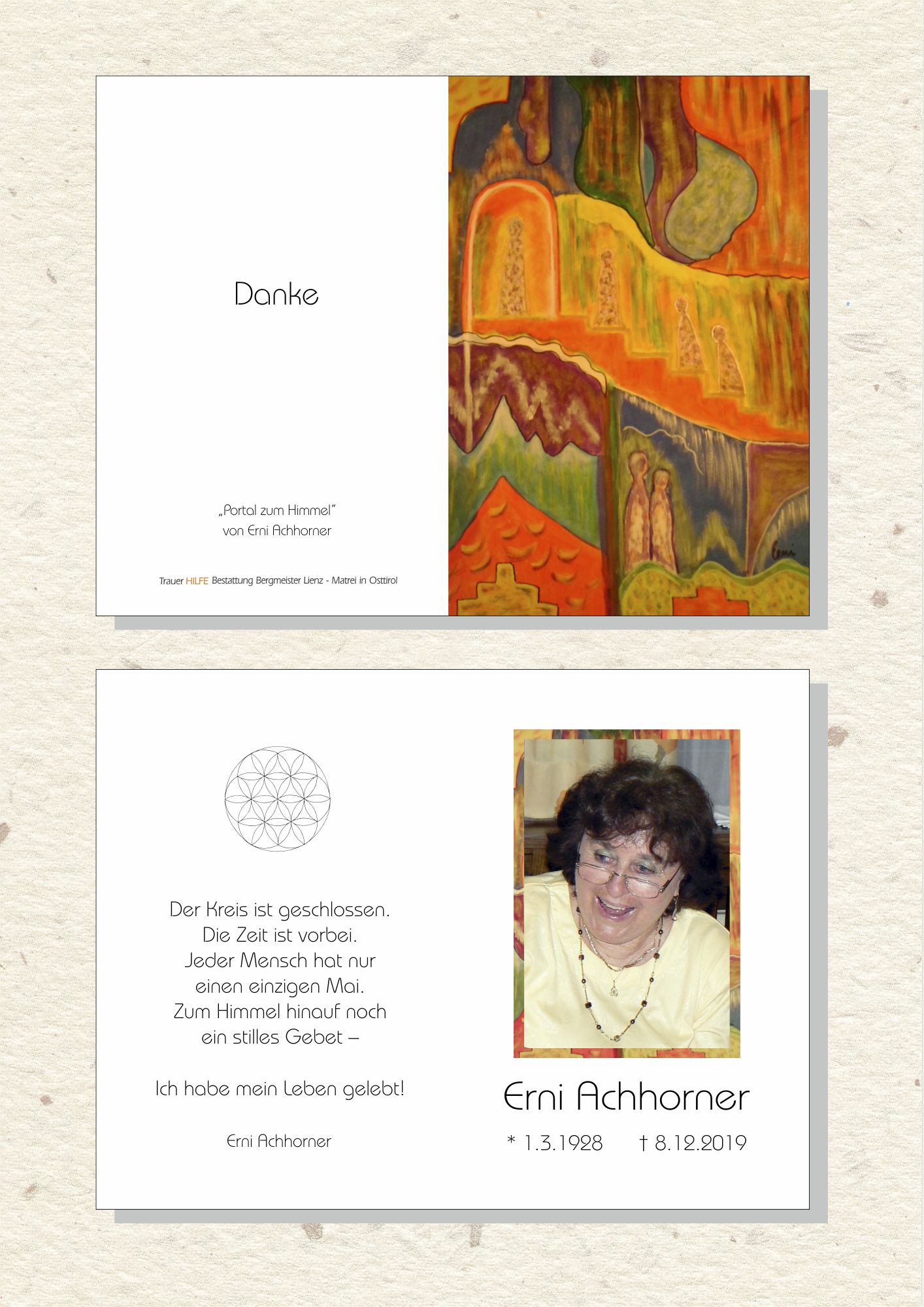 ein Leben lang. Liebe Trauerfamilie! Ich wünsche Euch von ganzem Herzen ein aufrichtiges Beileid und viel Kraft und Gottessegen für diese schwierige Zeit! Ich werde Erni immer in guter Erinnerung behalten! Besonders an die Zeit mit ihr bei der Singgemeinschaft! Erni war unsere seelische Stütze und Bereicherung! Ohne sie ging es einfach nicht, besonders ich fühlte mich an ihrer Seite immer geborgen! Erni, ich werde dich immer in meinen Herzen tragen! Ruhe nun sanft in Gottes Hand geborgen! Pfiat di, amol seg ma uns wieda!09.12.2019 17:41 - Waltraud Gluderer