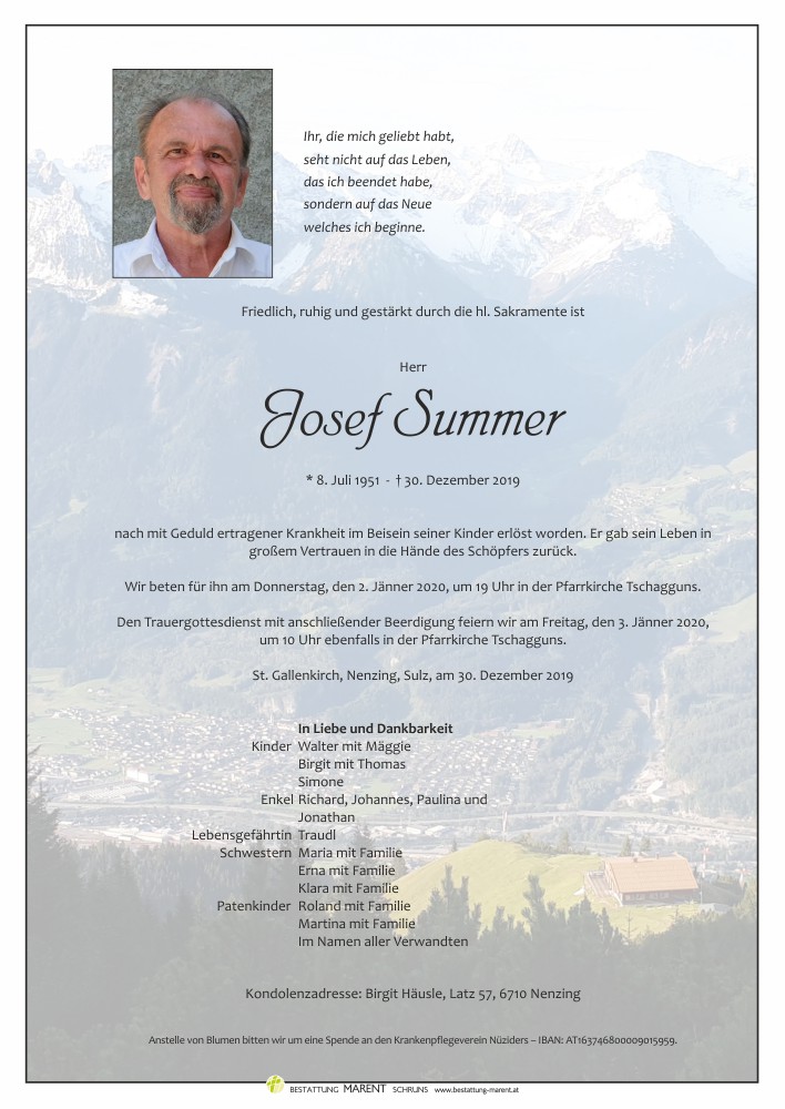 Bestattung wurde durchgeführt von: Peter Marent Bestattung Marent GmbH Gantschierstraße 80 6780 - Schruns Tel.: 05556 77070 zum Bestatter