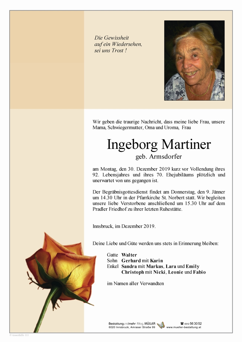 Bestattung wurde durchgeführt von: Mag. Martin Müller Concordia Bestattung 6020 - Innsbruck Reichenauer Str. 95 6060 - Hall i. T. Salzburger Str. 33 Tel.: 0512 34 34 33 Tel.: 05223 57 2 54 zum Bestatter