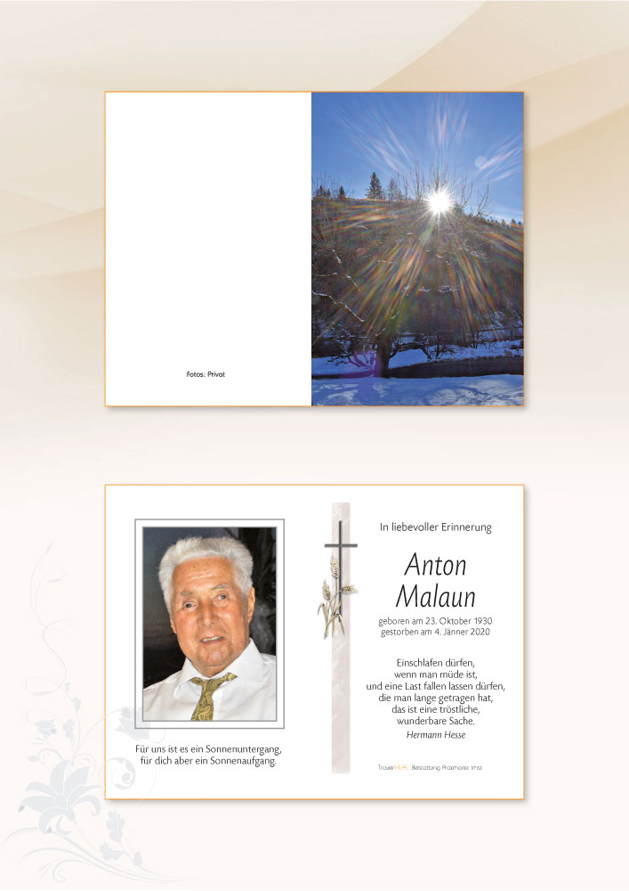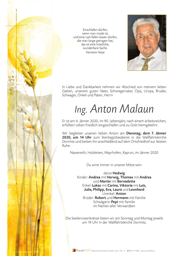 • Liebe Familie Mama in. Viele Jahre habe ich mit Anton beruflich zu tun gehabt. Seine menschliche und korrekte Art bei der Bezirkslandwirtschaftskammer und seiner Tätigkeit als Schätzer habe ich immer sehr geschätzt. Deine guten Werke gehen mit Dir. Ruhe in Frieden. Andreas