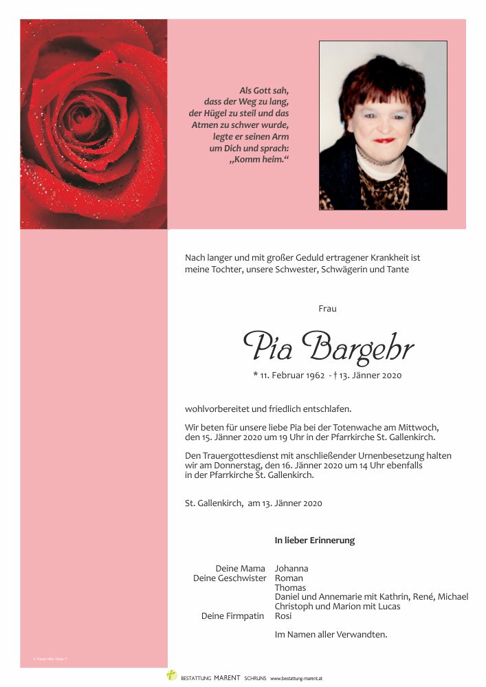 Bestattung wurde durchgeführt von: Peter Marent Bestattung Marent GmbH Gantschierstraße 80 6780 - Schruns Tel.: 05556 77070 zum Bestatter