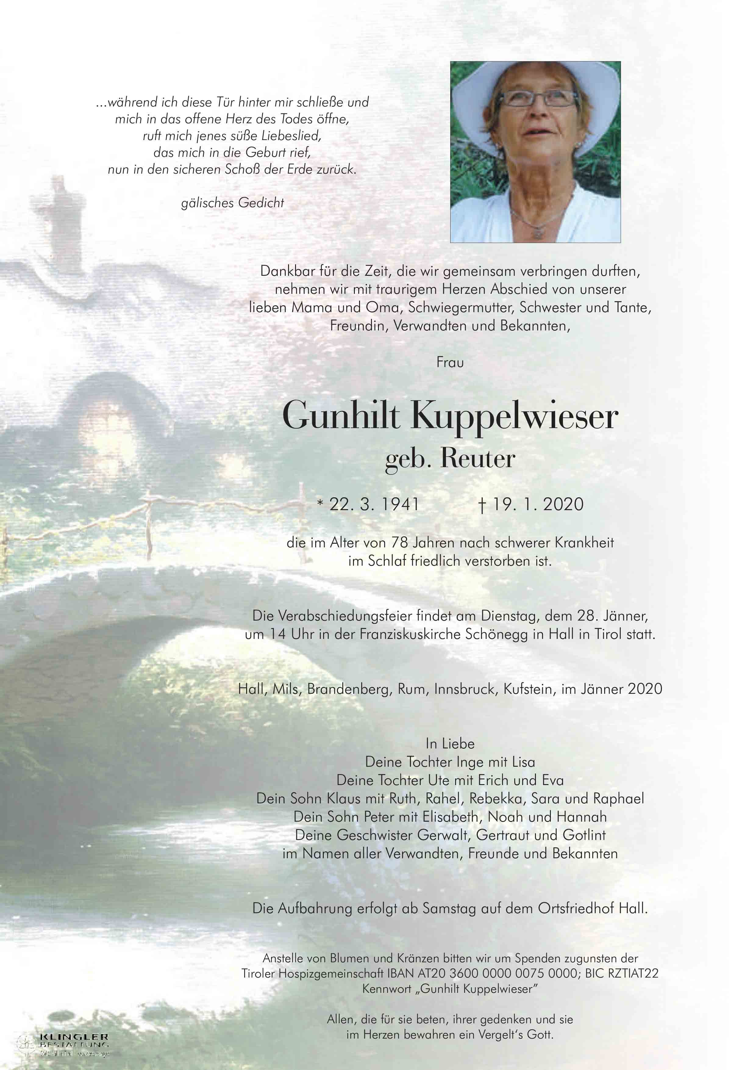 Bestattung wurde durchgeführt von: Mag. Martin Müller Concordia KLINGLER Bestattung Salzburger Straße 33 6060 - Hall in Tirol Tel.: 05223 57 25 40 zum Bestatter