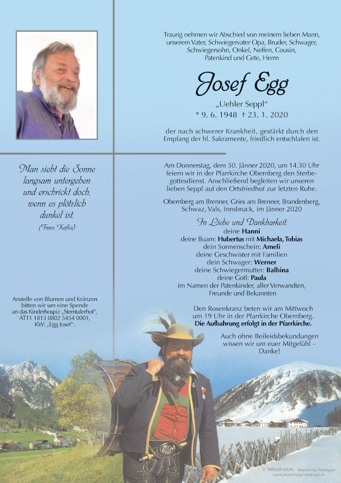 viel zu kurz war die Zeit mit Dir hier auf Erden. Es gibt so vieles was wir mit Dir noch gerne erlebt hätten. So tapfer hast Du deine Krankheit ertragen, nie gejammert oder Dich beklagt. Dein eiserner Lebenswille hat uns noch ein paar unvergesslich schöne Momente mit Dir geschenkt. Wir sind Dir von ganzen Herzen dankbar, so einen wundervollen Menschen wie Dich, als Opa für unsere Tochter gehabt zu haben. Wir wissen das Du stets an Ihrer Seite sein wirst und hoffen Du gibst gut auf uns acht von da oben. Wir danken Dir für die schöne Zeit und die vielen Erinnerungen, deinen leckeren Schweinsbraten mit Knedl und die Zeit die wir bei Dir wohnen durften. Wir werden nie vergessen wie Du immer auf deinem Bankl in da Sonne Spridalen gehackt hast oder aufm Balkon Schwammerlen putzt hast. Lieber Opa, wir vermissen Dich schmerzlich, dein Charme und dein Humor werden uns sehr fehlen. Wir gönnen Dir nun Deine Ruhe und werden Dich immer in unserem Herzen bewahren.