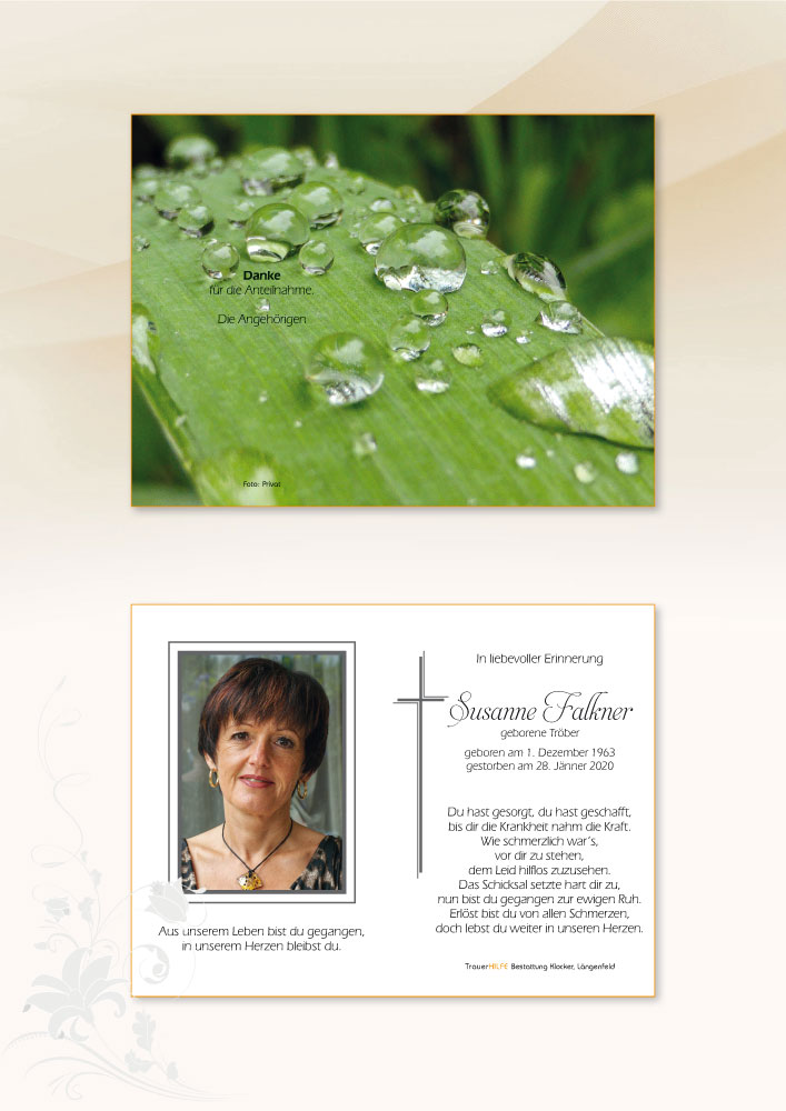 Wenn ich nicht mehr bin, sollt ihr nicht trauern, was ich wirkte und meine Liebe werden mich überdauern. Was mir widerfährt wie allem, ist nicht das Ende. Der Tod ist Übergang, Brücke in ein neues Sein, Zeitenwende. Er ist Tor ins Licht, Eintritt in die Ewigkeit, bedeutungslos sind nun Raum und Zeit. Dort, wo ich hingehe, werden wir uns wiedersehen und mit Christus auferstehen. Sie ruhe in Frieden!