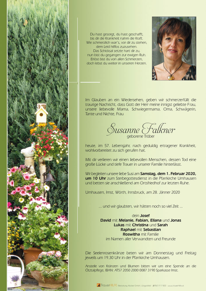Liebe Susanne es tut mir im Herzen so sehr weh dich nicht mehr zuhause besucht zu haben da wir im Krankenhaus im selben Zimmer waren und gegenseitig Mut zugesprochen haben tut mir leid , deshalb wünsche ich dir da wo du gerade bist schau auf deine Lieben und Ruhe Sanft in Gottes Händen du hast es dir verdient!
