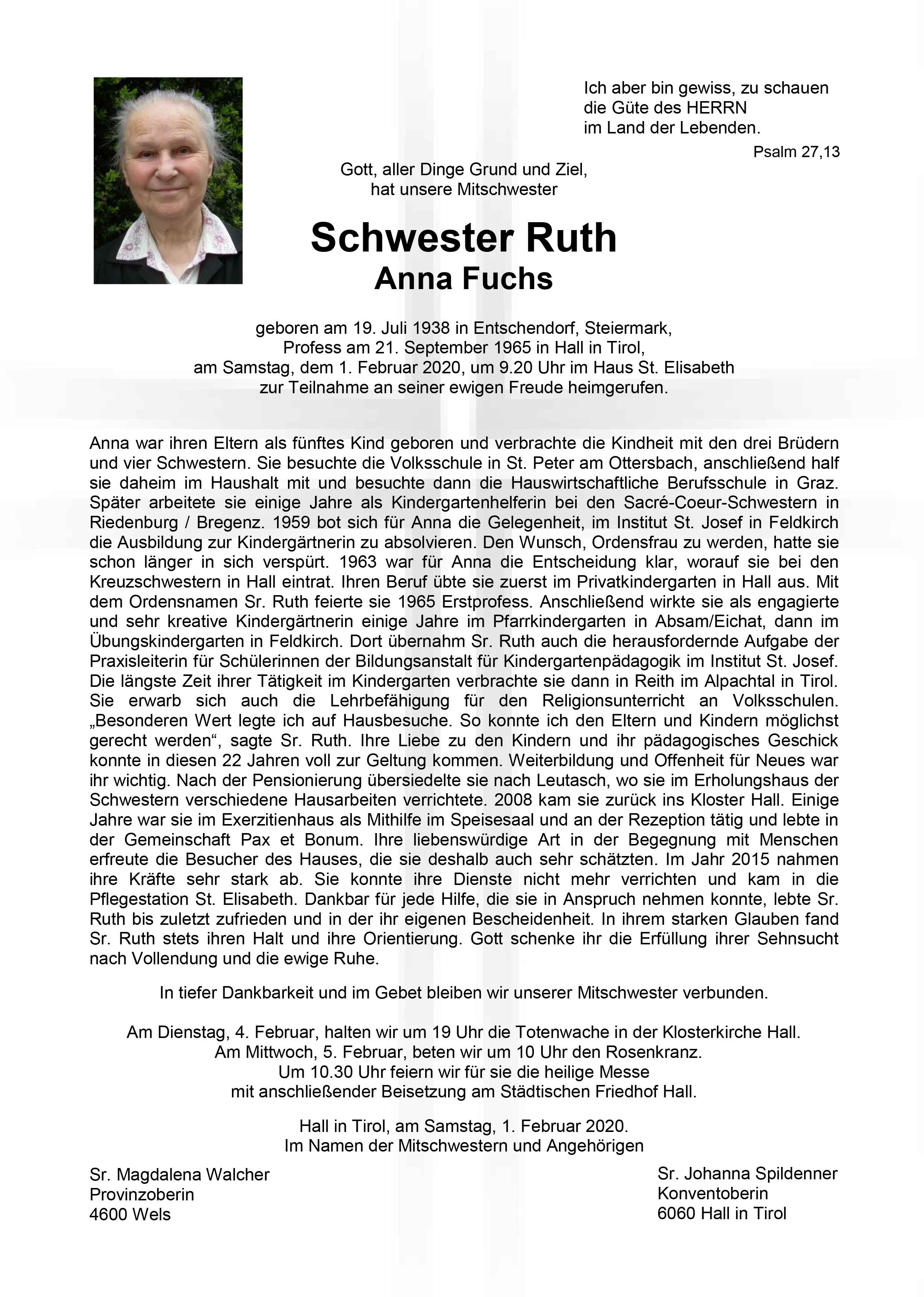 Liebe Schwester Ruth, gerne denke ich an unsere Zeit im Kindergarten Reith im Alpbachtal zurück. Wir hatten viel Spaß und Freude mit unserer gemeinsamen Arbeit in der Gruppe.