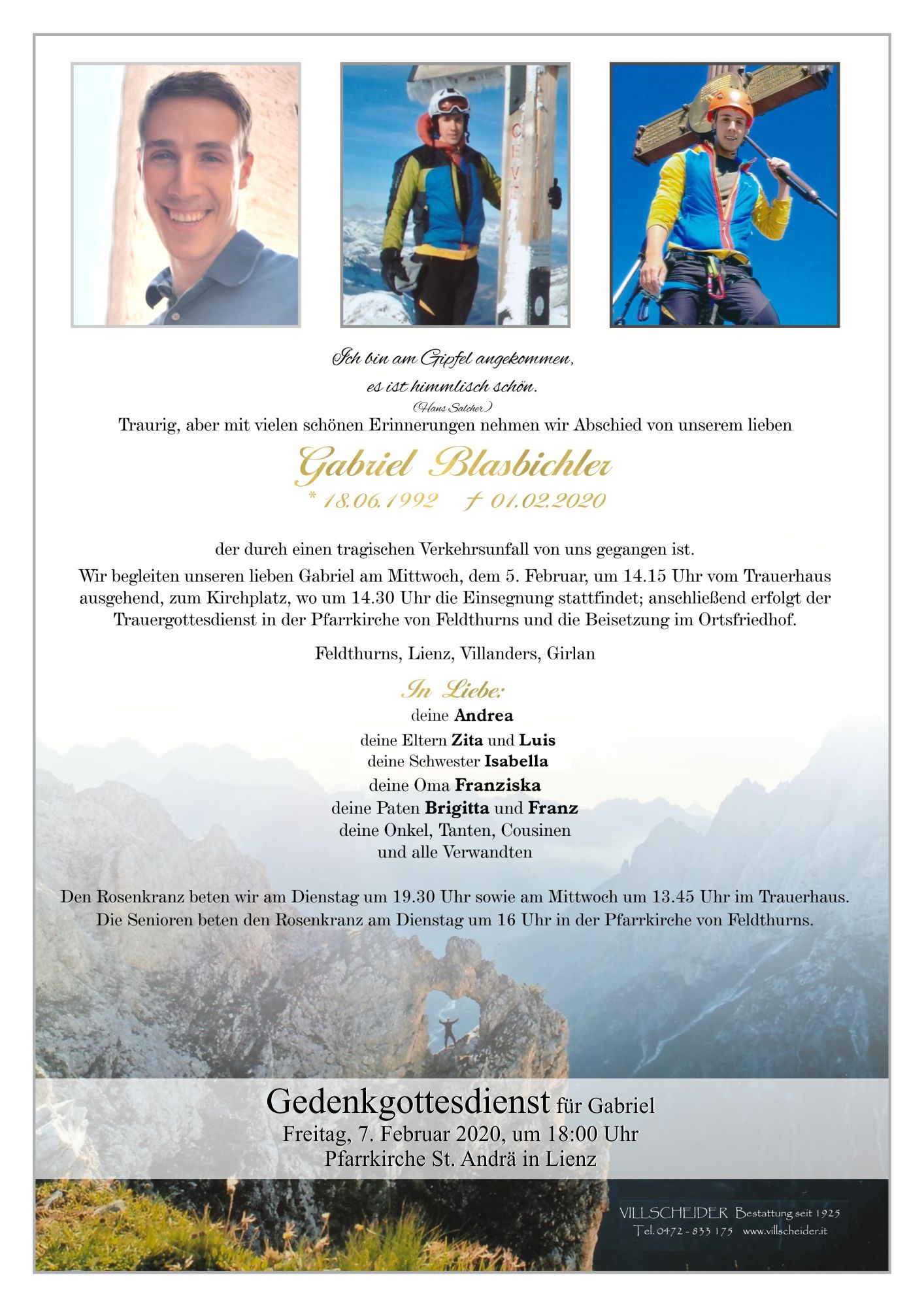 Während ihr euren geliebten Gabriel jetzt verabschiedet und ihn in Gottes Hände legt, bin ich in Gedanken ganz mit euch verbunden.