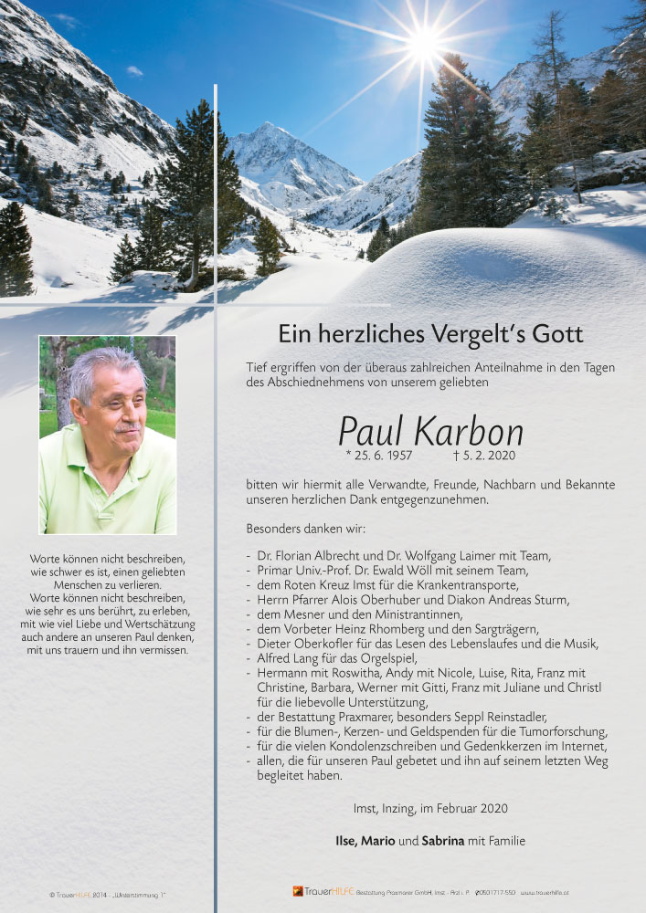 Wenn Worte trösten könnten, würde ich mehr schreiben, aber ich glaube, im Moment können keine Worte trösten. Höchstens die Worte, die euch von Paul im Ohr sind, sein Lachen, sein Gang, sein Tun, sein ganzes Sein. Paul wie er eben war - großzügig, geschickt, interessiert; ein Familienmensch durch und durch. Eines ist sicher, von dem Menschen, den wir lieben, wird immer etwas in unseren Herzen bleiben und die Erinnerungen an ihn werden uns trösten.