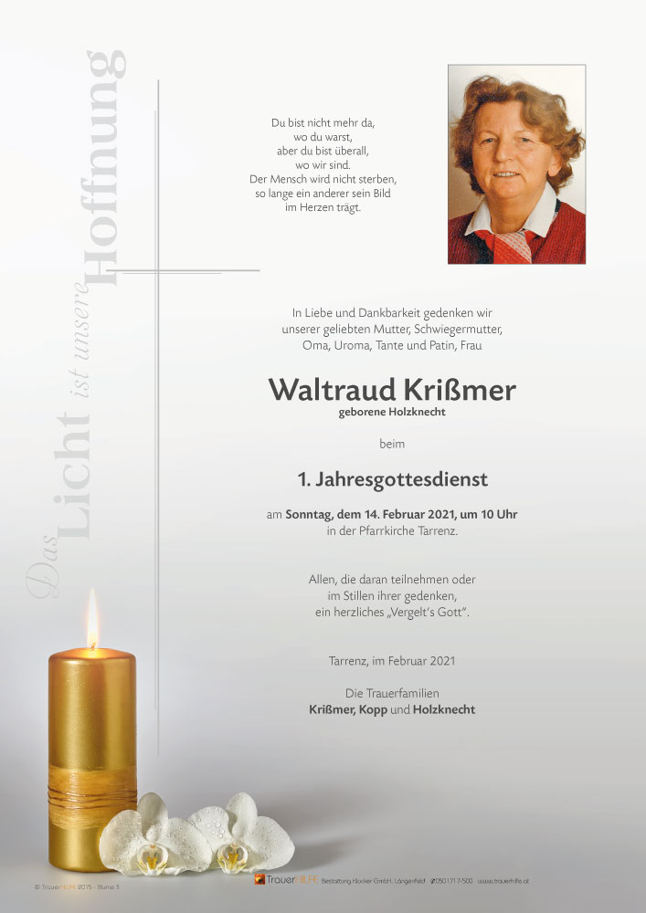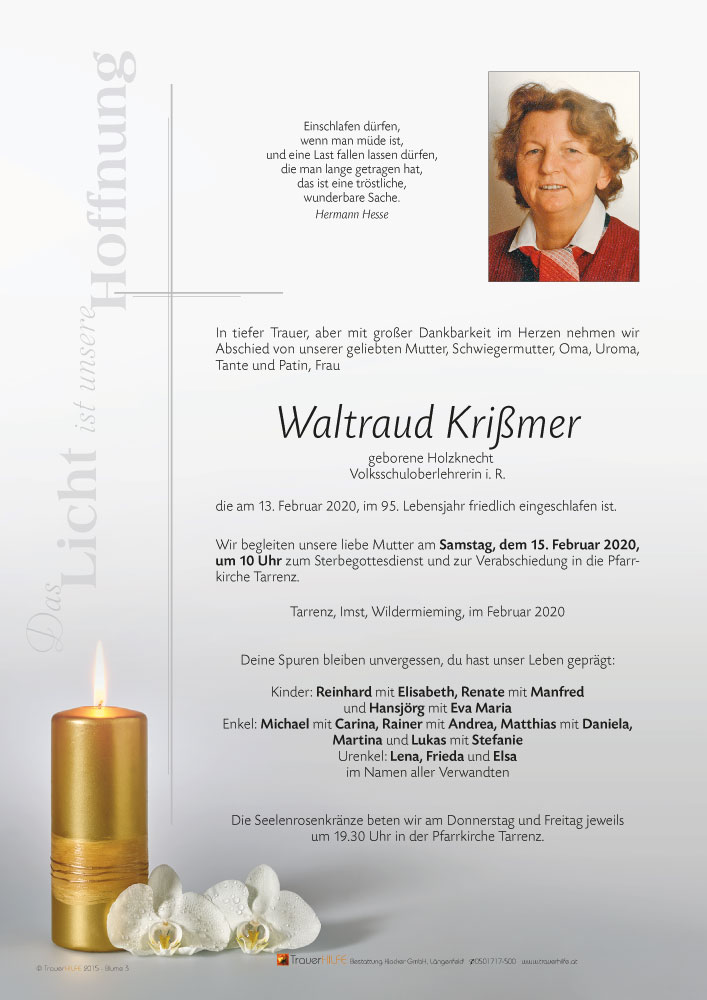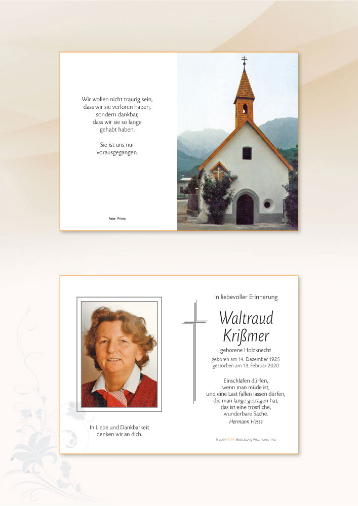 Liebe Trauerfamilie, liebe Renate wir wünschen euch in dieser Zeit viel Kraft und hoffen, dass viele dieser Erinnerungen in euch weiterleben. SGS Imst Team14.02.2020 08:12 - Sozialsprengel Imst & Umgebung