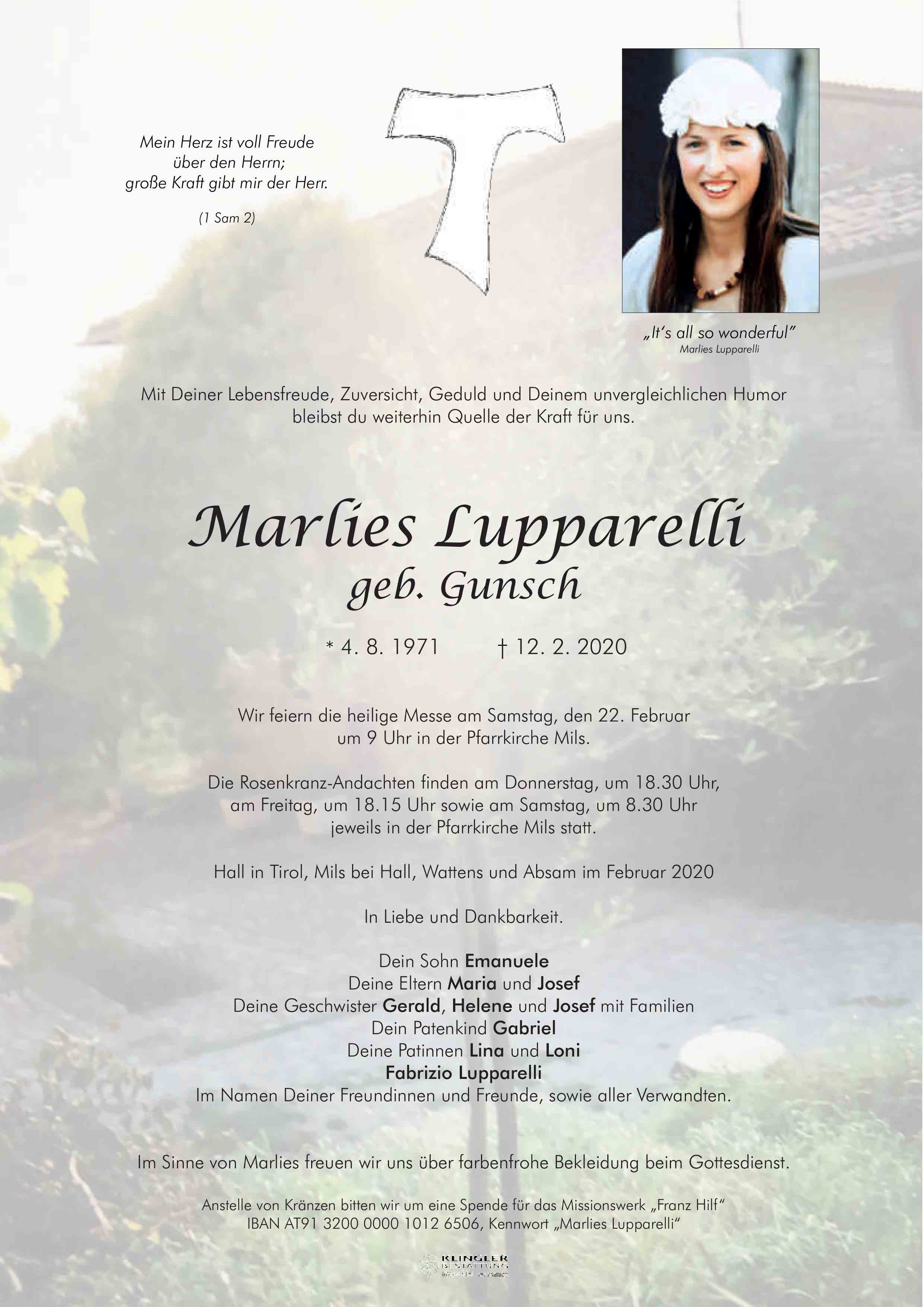 Liebe Trauerfamilie wir wünschen euch in dieser schweren Zeit des Abschieds nehmen von eurer geliebten Marlies viel Kraft Albert Andrea Florian und Alexander Tschoner14.02.2020 18:52 - Andrea und Albert Tschoner