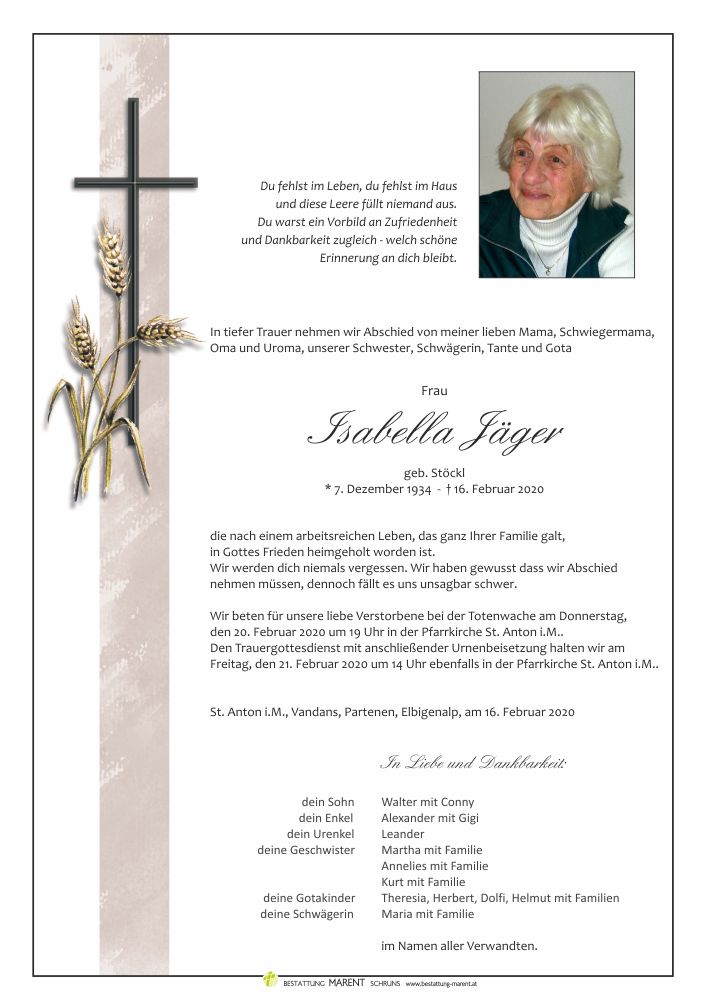 Lieber Walter mit Familie! Wer einen so wunderbaren Menschen verliert, wie Isabella es war, behält viele schöne Erinnerungen in seinem Herzen. Ich bewahre meine schönen Erinnerungen an Isabella auch fest in meinem Herzen. Leider kann ich nicht zum Trauergottesdienst nach St. Anton kommen, ich werde aber am Freitag in der Wallfahrtskirche in Absam ein Licht für Isabella entzünden.