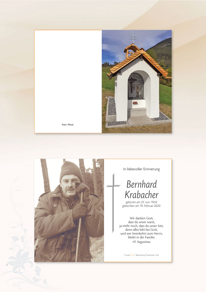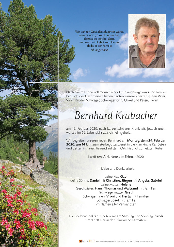 Danke Bernhard für die Stunden die ich mit Dir verbringen durfte Bernhard Du bist jetzt an den Gipfel namens Paradies angekommen den wir alle erst besteigen müssen wo die alpenrosen und edelweiss für immer blühen die Bäche rauschen ins tal mit lautem klang die Nebel lautlos zihn und der wind dazu spielt ewig seine Melodien Bernhard Du bist nicht fort Du bist uns nur voraus im Paradies weidmannsruh Bernhard herzliches Beileid der Familie Charly m