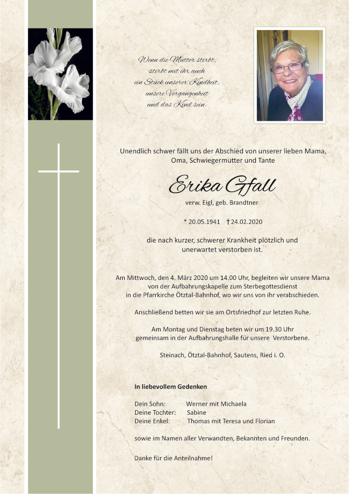 Bestattung wurde durchgeführt von: Karl Neurauter Karl Neurauter Bestattung Heidegger Brennerstraße 69 6150 - Steinach am Brenner Tel.: 05275 5211 zum Bestatter