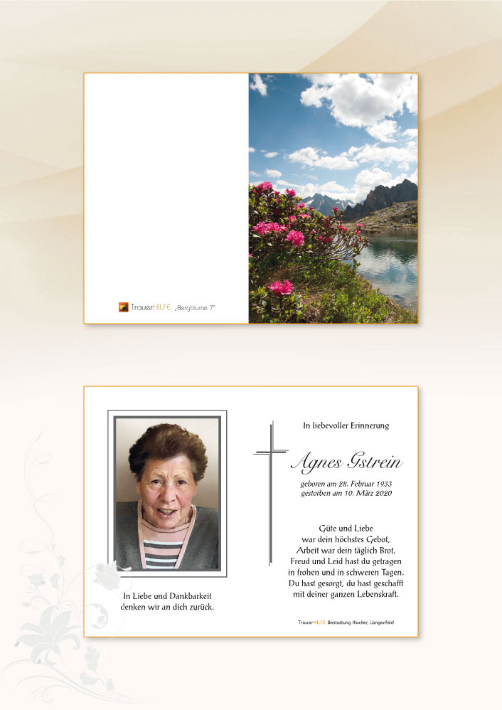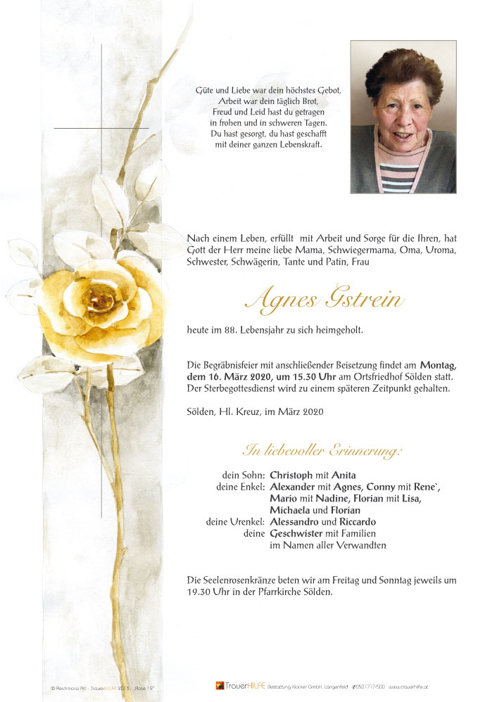 Agnes hat ein gutes Herz besessen, nun ruht es still, doch unvergessen.