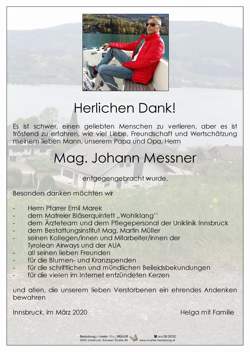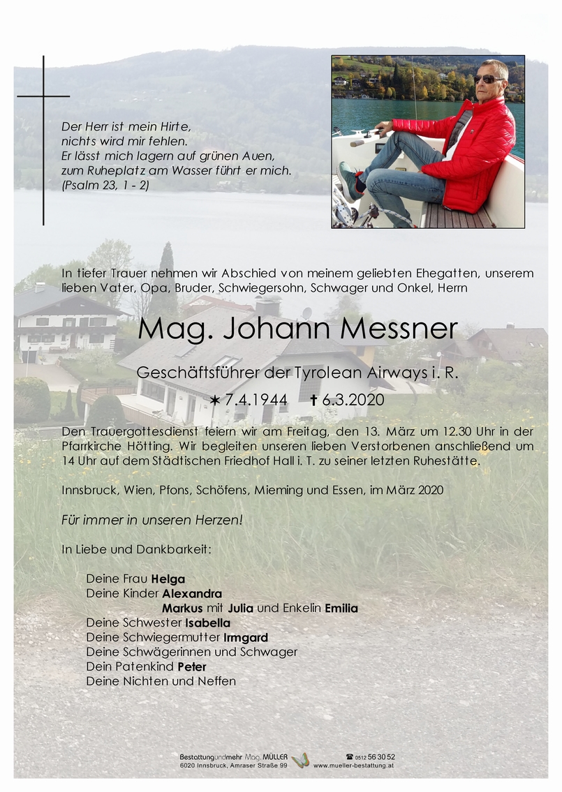 Bestattung wurde durchgeführt von: Mag. Martin Müller Concordia Bestattung 6020 - Innsbruck Reichenauer Str. 95 6060 - Hall i. T. Salzburger Str. 33 Tel.: 0512 34 34 33 Tel.: 05223 57 2 54 zum Bestatter