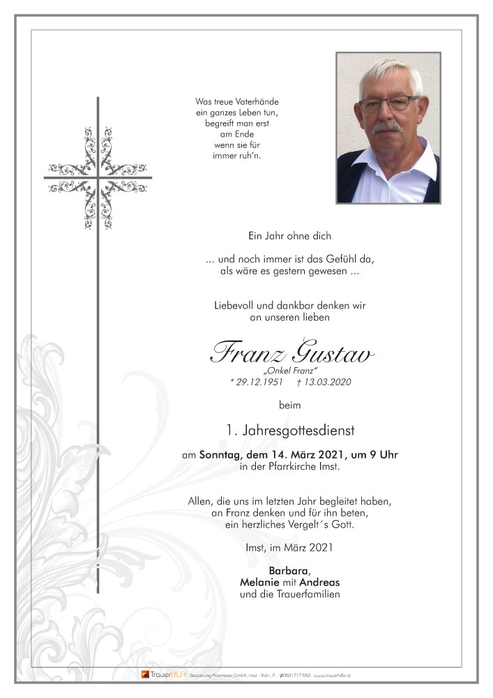 So möchten wir euch auf diesem Weg viel Kraft und Segen wünschen für diese schwere Zeit der Trauer, dass ihr getröstet seid in dem Gedanken, dass Franz euch nahe ist.
