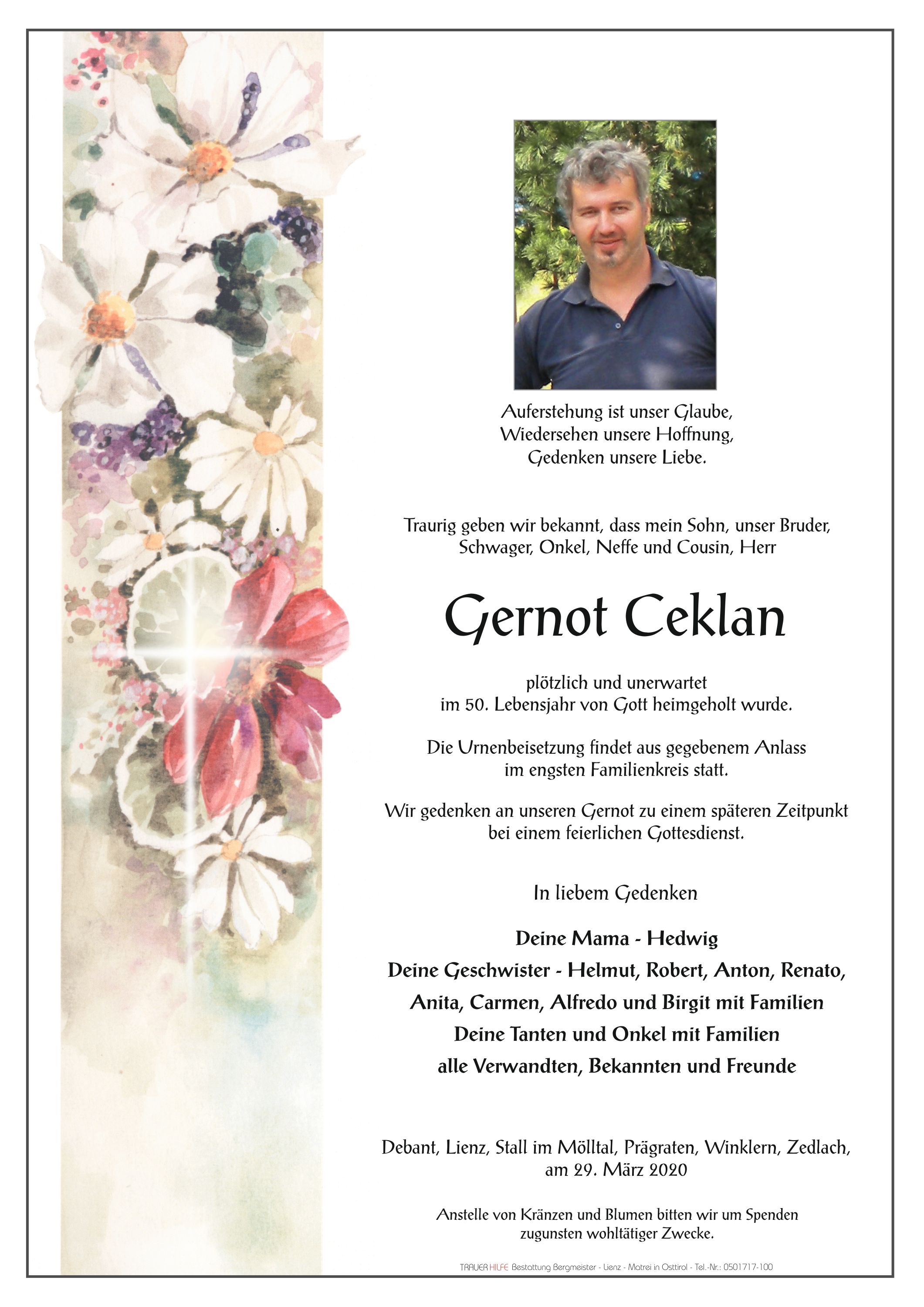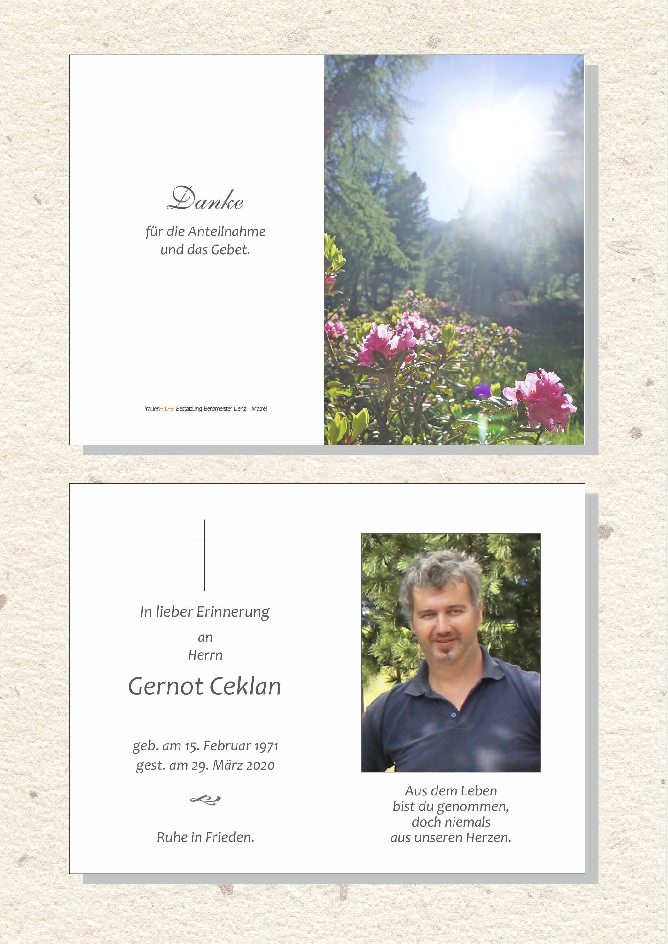 Liebe Familie Ceklan Unser Beileid Engeln beschützen euren Gernot.Wir kennen die ganze Familie.Haben uns geholfen Möbel einbauen in der Alt Debant.Viel kraft der Familie