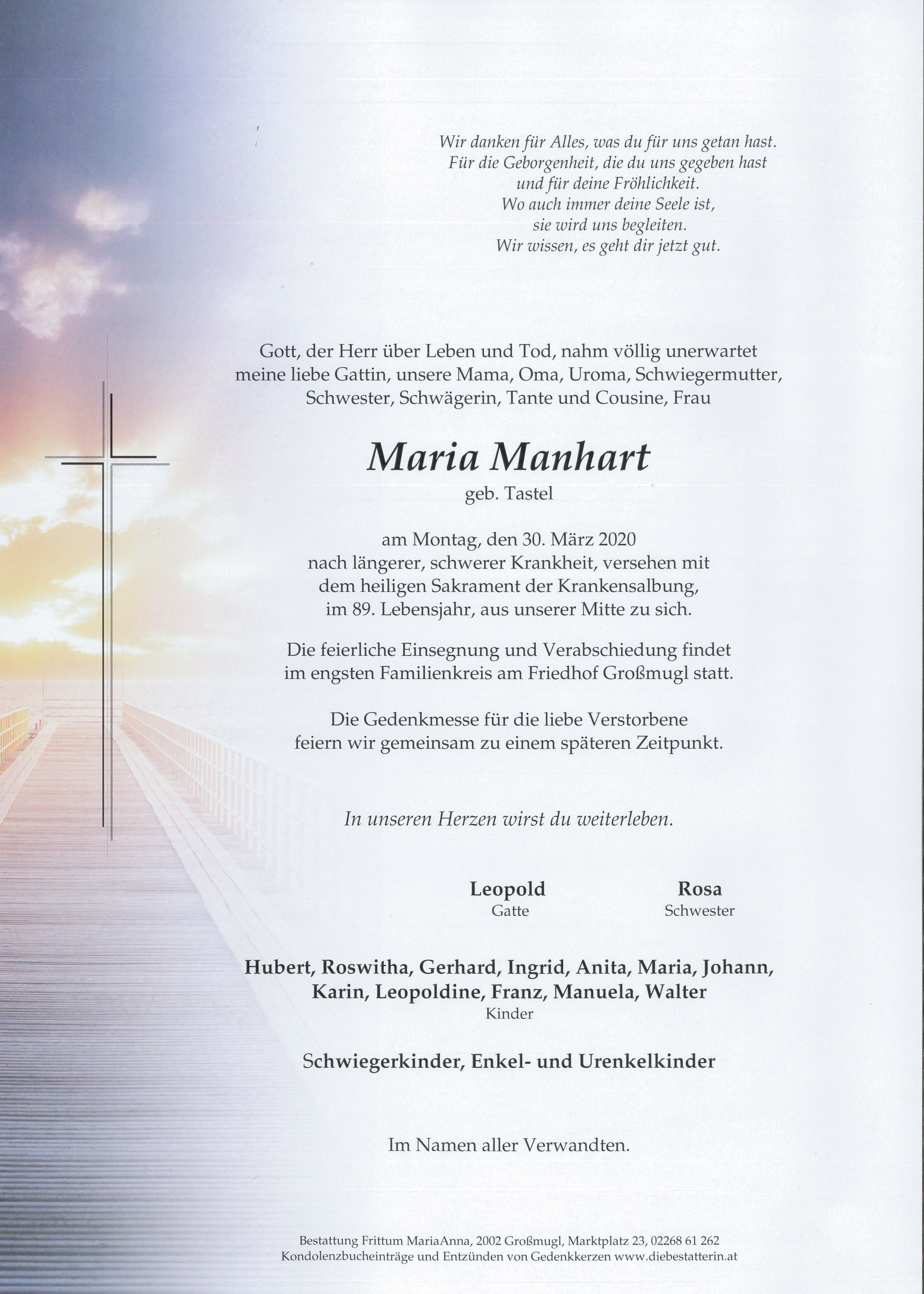 Bestattung wurde durchgeführt von: Frittum Maria Anna TrauerHilfe Bestattung Frittum Bahnstrasse 255 2041 - Wullersdorf Tel.: 050 1717-600 zum Bestatter
