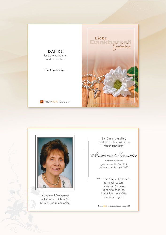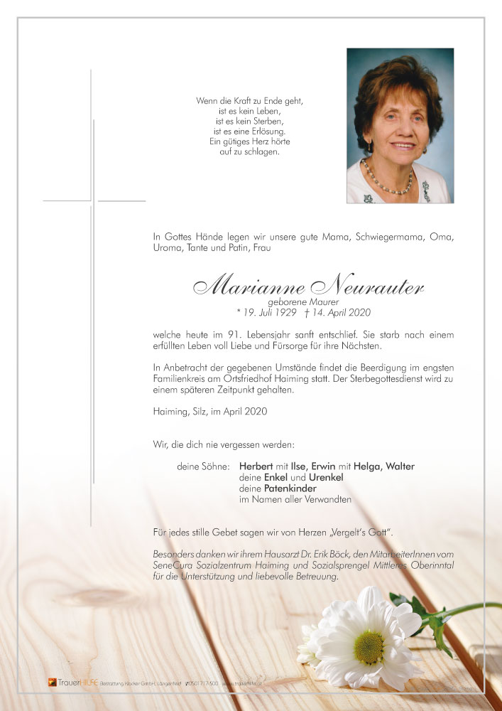 Lieber Herbert, lieber Erwin, lieber Walter, geschätzte Trauerfamilie! Wir möchten euch unser ganzes Mitgefühl zum Heimgang eurer Marianne ausdrücken. Mit ihr verbinde ich viele, schöne Kindheitserinnerungen. Möge sie ihren verdienten, ewigen Frieden an der Seite ihres Mannes Karl finden.