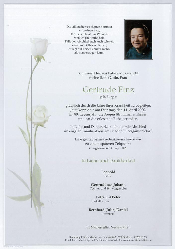 Bestattung wurde durchgeführt von: Frittum Maria Anna TrauerHilfe Bestattung Frittum Bahnstrasse 255 2041 - Wullersdorf Tel.: 050 1717-600 zum Bestatter