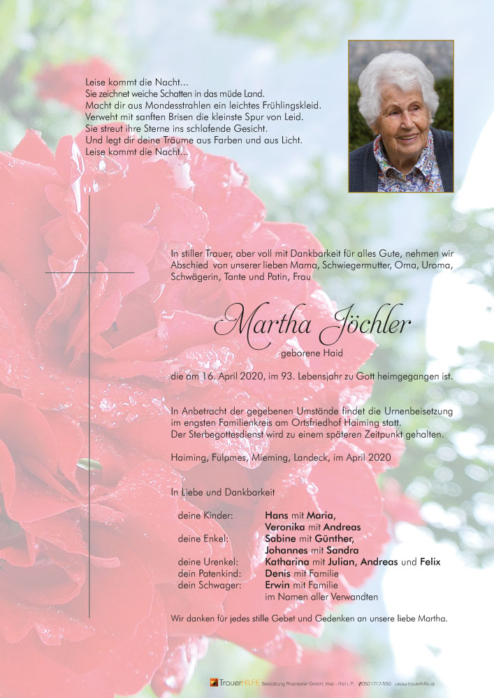 Friedhof Haiming, † 16.04.2020 (92 Jahre)