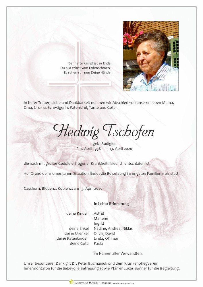 Bestattung wurde durchgeführt von: Peter Marent Bestattung Marent GmbH Gantschierstraße 80 6780 - Schruns Tel.: 05556 77070 zum Bestatter