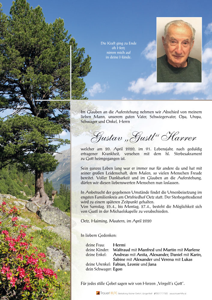 Liebe Hermi undTrauerfamilien: unser aufrichtiges Beileid zum Tod deines Mannes,eures Vaters wünschen die Sölders Nachbaren Philipp, Hannes mit Fam. und Gustl21.04.2020 17:53 - Gstrein Gustl