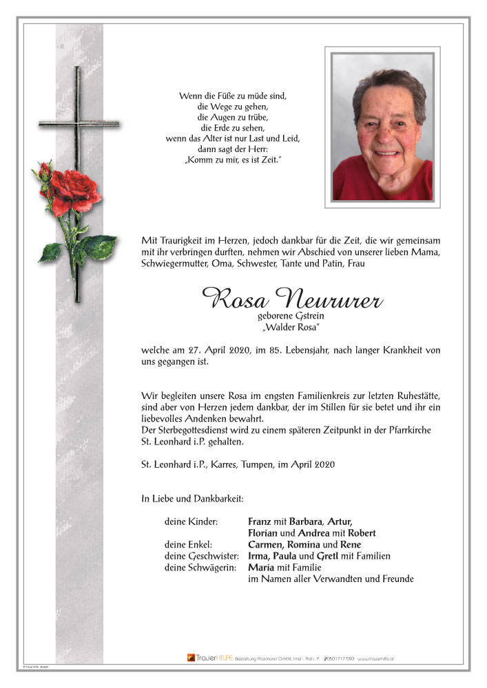Unser Aufrichtiges Beileid zum Heimgang eurer Mutter wünschen wir euch viel Kraft in dieser schweren Zeit.28.04.2020 19:34 - Bernadette Santer m. Familie