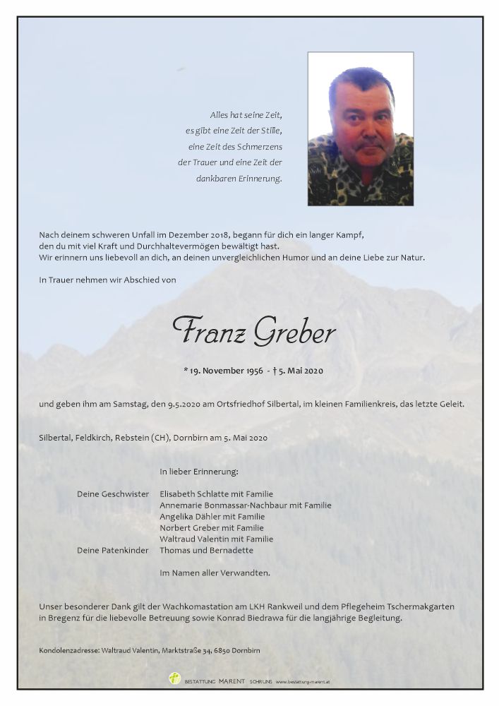 Bestattung wurde durchgeführt von: Peter Marent Bestattung Marent GmbH Gantschierstraße 80 6780 - Schruns Tel.: 05556 77070 zum Bestatter