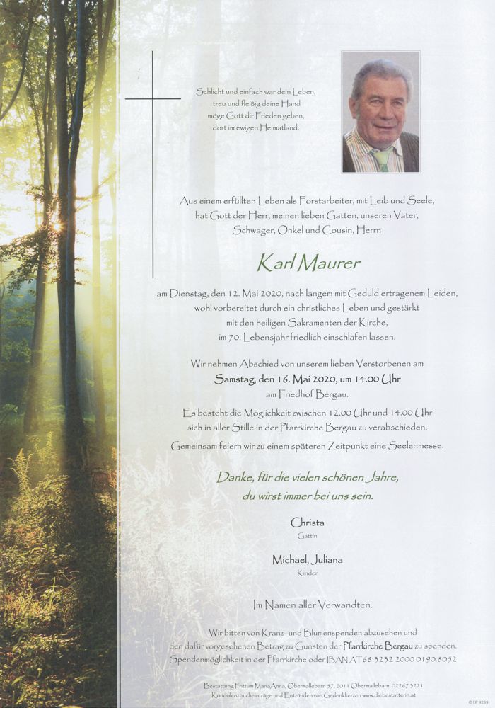 • Die Katholische Männerbewegung hat mit Karl den Obmann in der Pfarre Bergau verloren. Wir danken dir für deine große und aufopfernde Mitarbeit für die Männerbewegung und werden dir im Gebet gedenken und dir ein ehrendes Andenken bewahren. Unsere aufrichtige Anteilnahme der Familie. Franz Amon, Freund und Altdekanatsobmann.