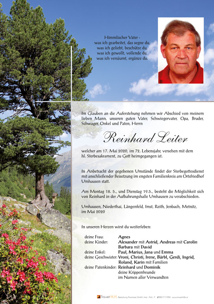Aufrichtige Anteilnahme am Tode Eures lieben Reinhard entbieten Familie Scharfetter, Gasthof Andreas Hofer, Umhausen.18.05.2020 23:28 - Familie Scharfetter Umhausen