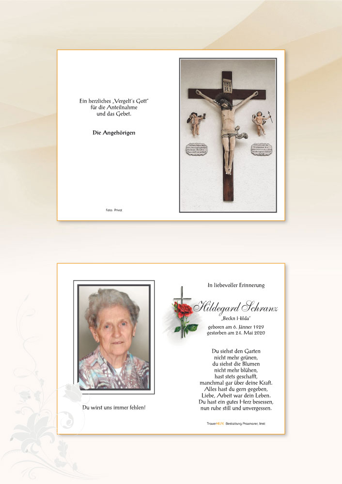 Wir möchten uns nochmals bei dir bedanken, dass du uns als Kinder immer so gut bei dir aufgenommen hast. Wir durften dir täglich bei der Stallarbeit helfen. Dabei hast du uns viel beigebracht wie beispielsweise sauberes kehren. Dankbar waren wir auch immer, dass du uns nach Hause begleitet hast, wenn es nach der Stallarbeit draußen schon dunkel war . Auch heute noch haben wir uns sehr gefreut, wenn du zum Kaffee trinken zu uns gekommen bist oder wir dich besucht haben. Wir werden dich in lieber Erinnerung und immer im Herzen behalten und uns oft an die schönen Stunden mit dir zurück erinnern.