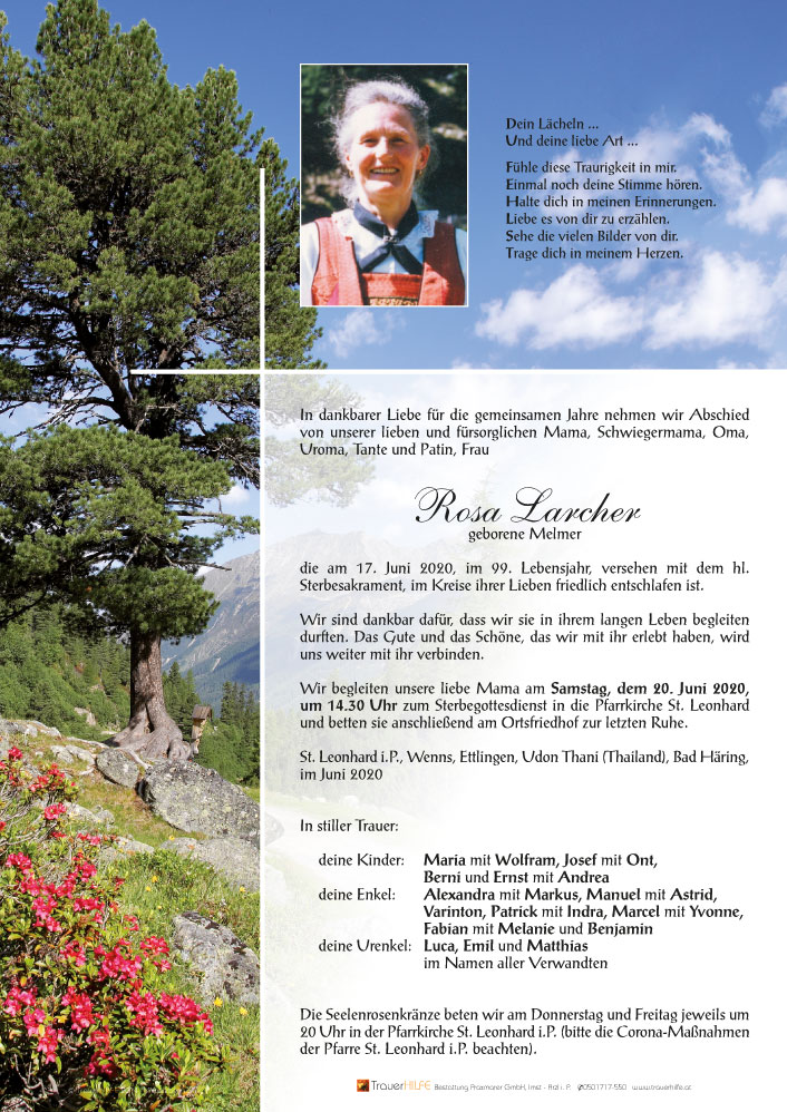 Wir möchten euch allen zum Ableben eurer lieben Rosa unser aufrichtiges Beileid aussprechen und viel Kraft für die schwere Zeit wünschen.19.06.2020 20:29 - Bair Barbara, Irene & Bernhard mit Familie