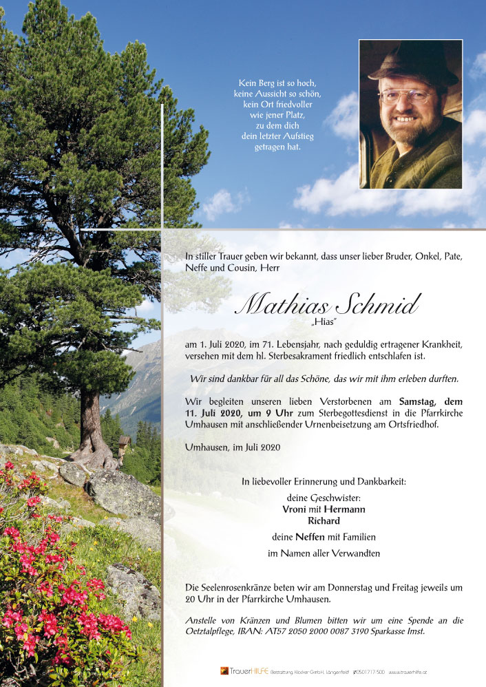 Aufrichtige Anteilnahme am Tode Eures lieben Mathias entbieten Familie Scharfetter, Gasthof Andreas Hofer Umhausen.05.07.2020 13:18 - Familie Scharfetter Umhausen