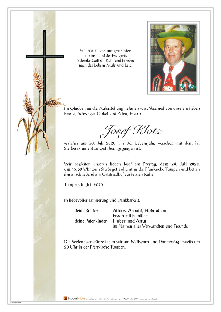 Lieber Josef, wir durften dich ein Stück weit in deinem Leben begleiten. Wir haben dich als einen sehr freundlichen, friedliebenden und sehr genügsamen Menschen gekannt.