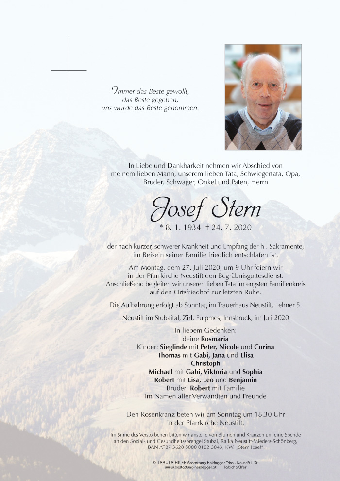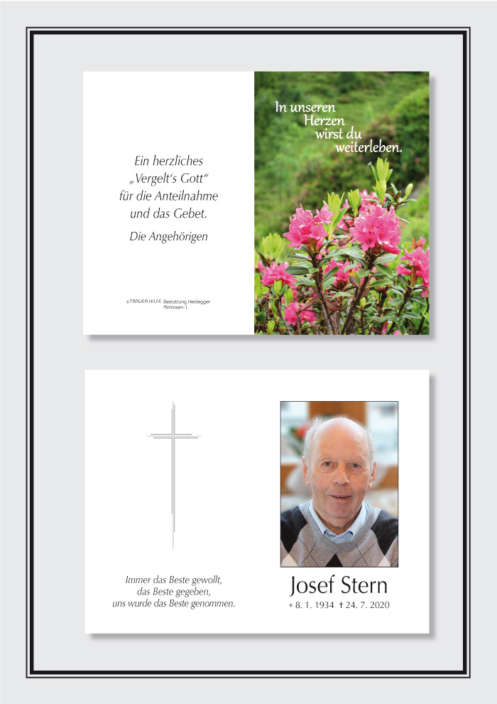 du warst deinen Enkelkindern stets ein liebevoller Opa und ein guter Spielkamerad. Ich danke dir für die vielen gemeinsamen Stunden und für deine Hilfe, wenn wir sie brauchten. Nun bist du erlöst und kannst in Frieden ruhen!01.08.2020 17:06 - Danke für alles!