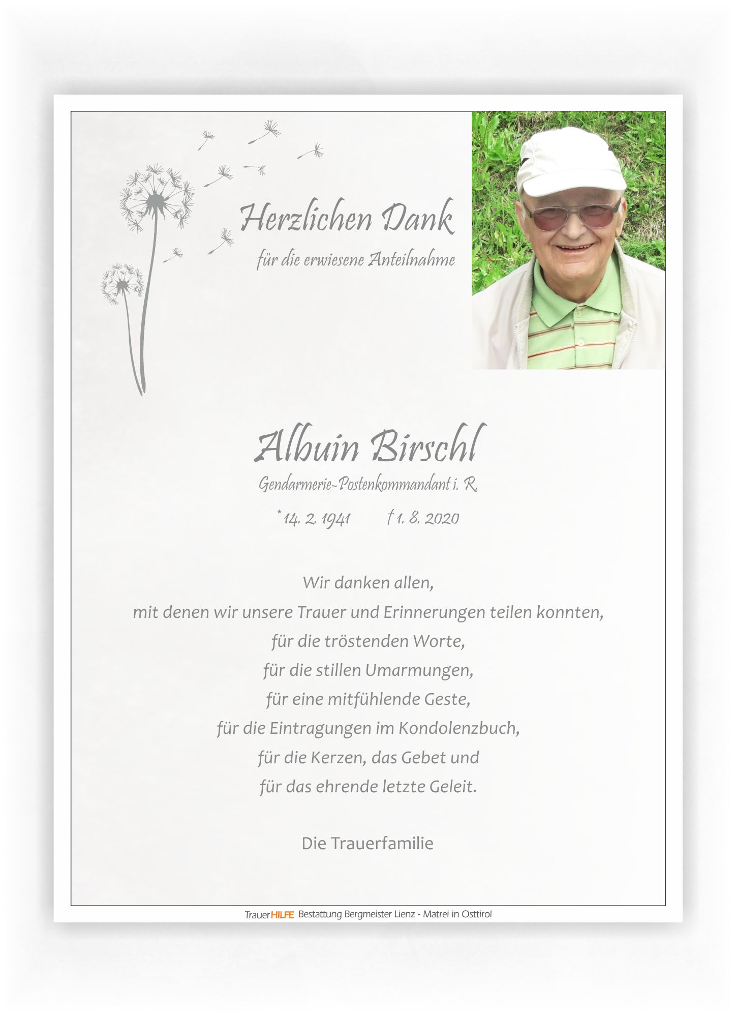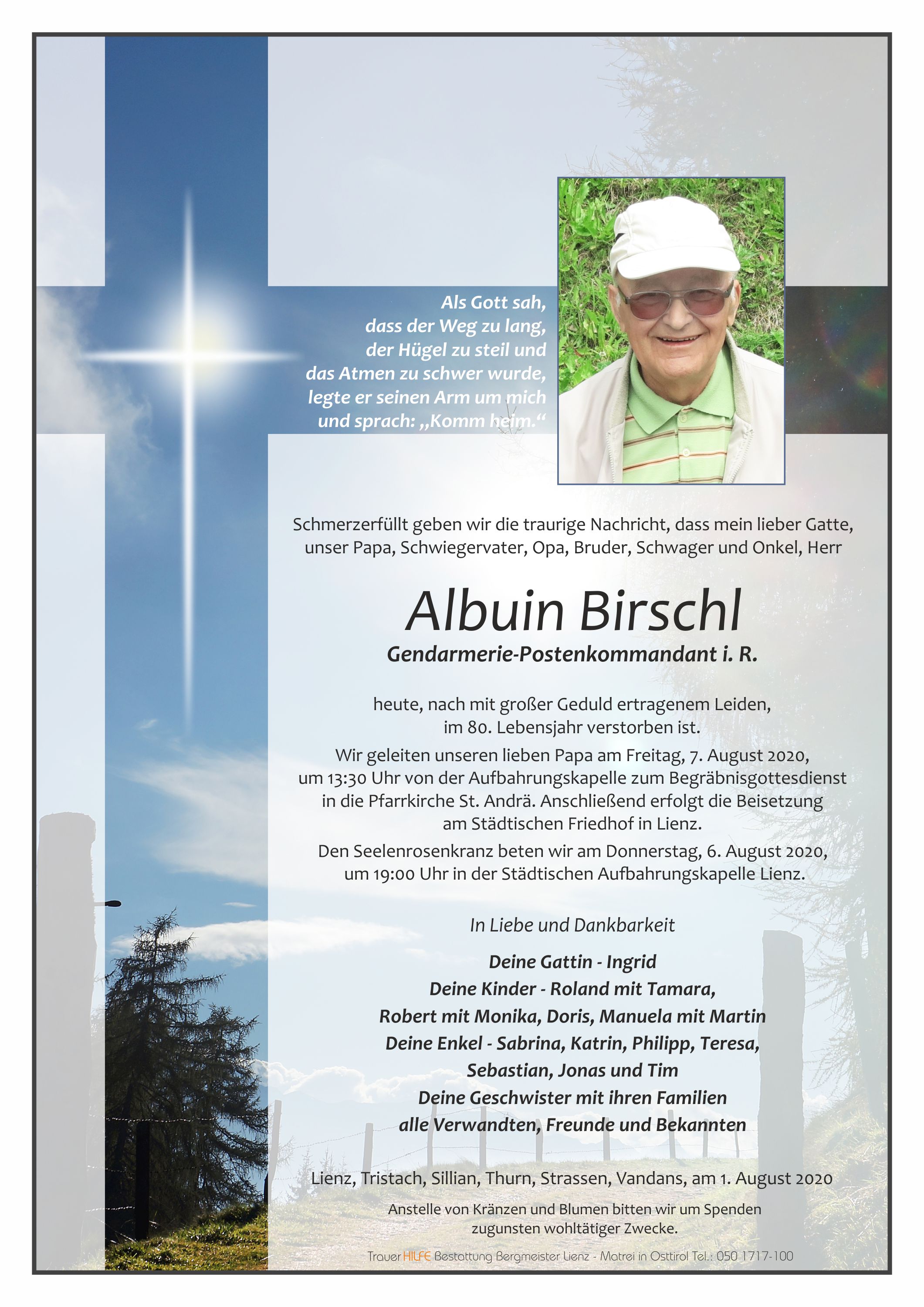Lieber Albuin, nun hast auch Du die letzte Reise angetreten. Es waren bewegte und besondere Jahre, in denen wir uns kannten und manches Gespräch miteinander hatten. Als Hüter der Ordnung bist Du trotz Pflichtbewusssein auch immer Mensch gewesen, und das hat Dich besonders ausgezeichnet. Danke für viele nette Gespräche, für die schönen Momente im Leben. Du warste Beispiel und auch Vorbild für viele, wenn nicht perfekt so doch immer herzlicher Mensch. Es ist schade um Dich, doch bleibst Du in angenehmer Erinnerung mitten unter uns. Deiner Frau und Deinen Kindern mit ihren Familien unsere aufrichtige Anteilnahme, möge die Erinnerung an Deinen Humor die Trauer bald verwehen. Pfiat di Albuin.