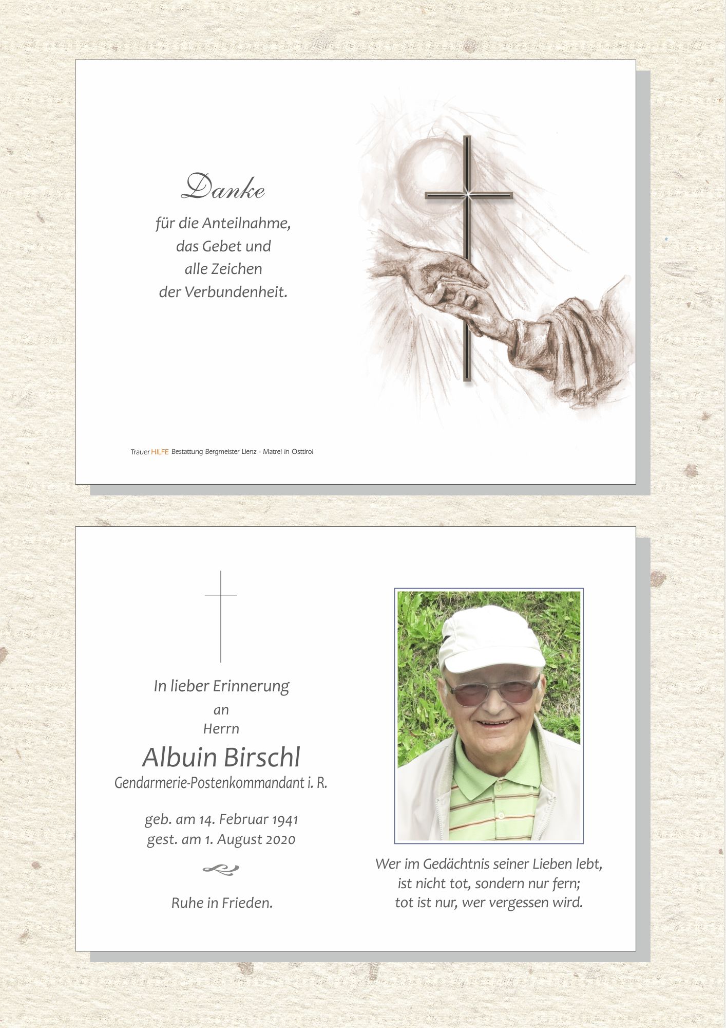 Lieber Albuin, nun hast auch Du die letzte Reise angetreten. Es waren bewegte und besondere Jahre, in denen wir uns kannten und manches Gespräch miteinander hatten. Als Hüter der Ordnung bist Du trotz Pflichtbewusssein auch immer Mensch gewesen, und das hat Dich besonders ausgezeichnet. Danke für viele nette Gespräche, für die schönen Momente im Leben. Du warste Beispiel und auch Vorbild für viele, wenn nicht perfekt so doch immer herzlicher Mensch. Es ist schade um Fich, doch bleibst Du in angenehmer Eriinerung mutten unter uns. Deiner Frau und den Kindern mit ihren Familien unsere aufrichtige Anteilnahme, möge die Erinnerung an Deinen Humor die Trauer bald verwehen. Pfiat di Albuin.
