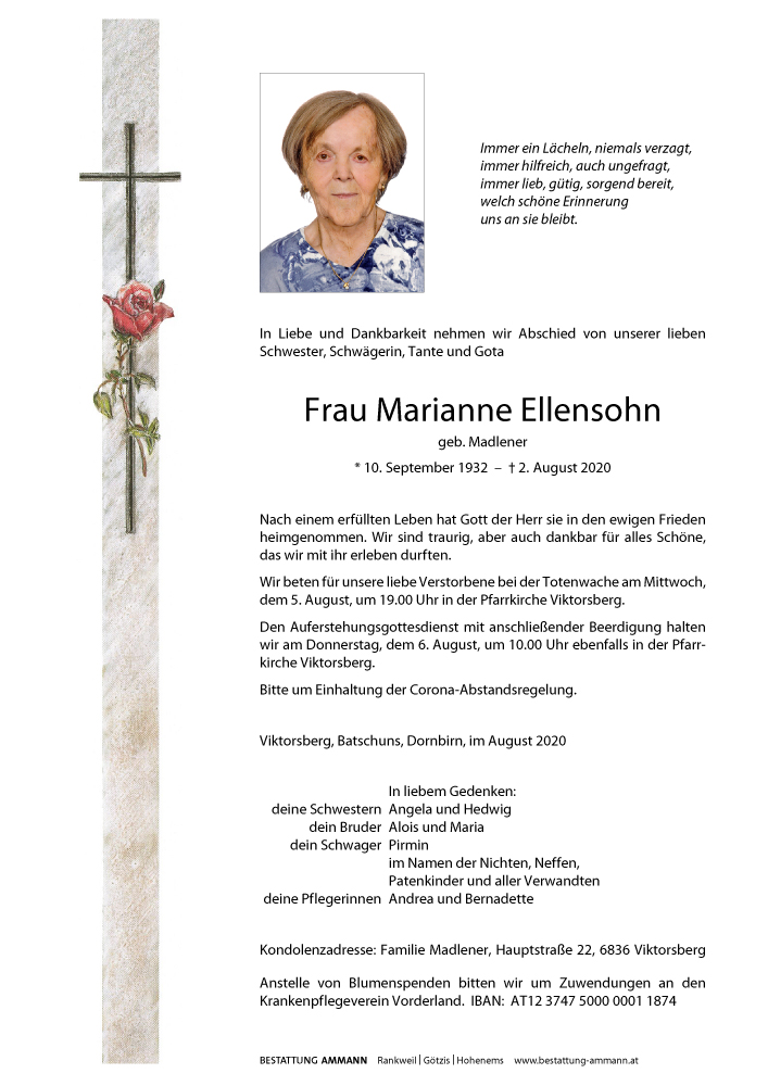 Bestattung wurde durchgeführt von: Bestattung Ammann Rankweil Ammann Bestattung GmbH Rankweil Splügenweg 1 6830 - Rankweil Tel.: 05522 42104 zum Bestatter