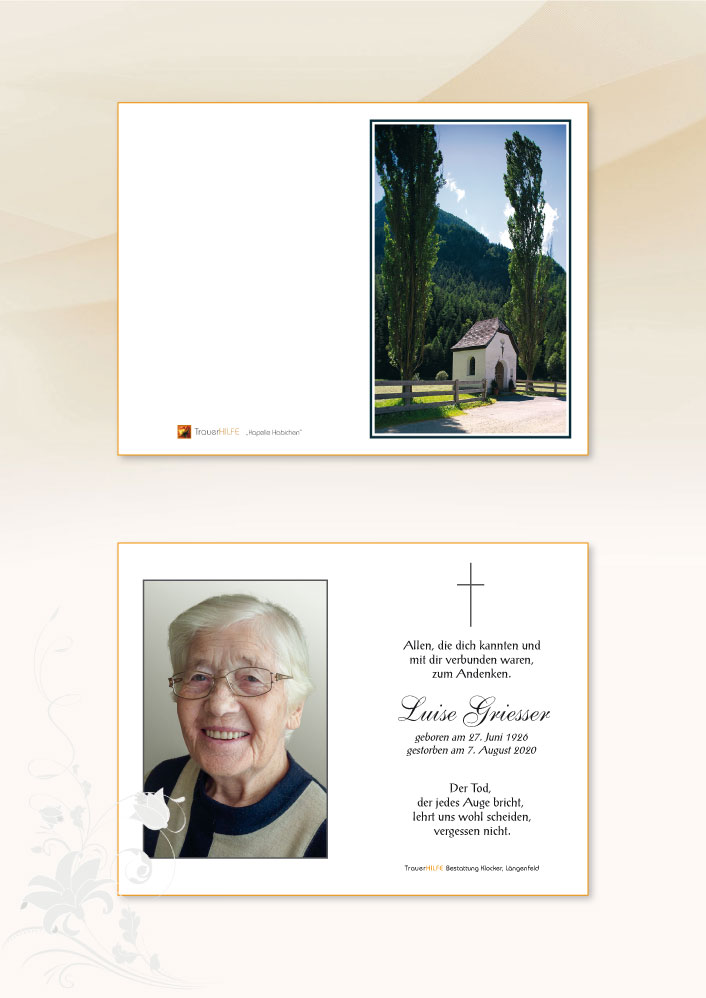 Bestattung wurde durchgeführt von: Daniel Klocker Bestattung Klocker GmbH Oberlängenfeld 41 6444 - Längenfeld Tel.: 05253 5561 zum Bestatter