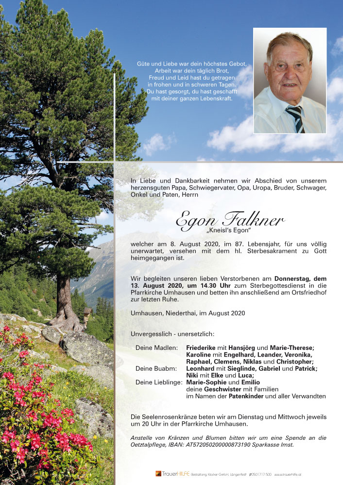 Aufrichtige Anteilnahme am Tode Eures lieben Egon entbieten Familie Scharfetter, Gasthof Andreas Hofer Umhausen.12.08.2020 01:32 - Familie Scharfetter Umhausen