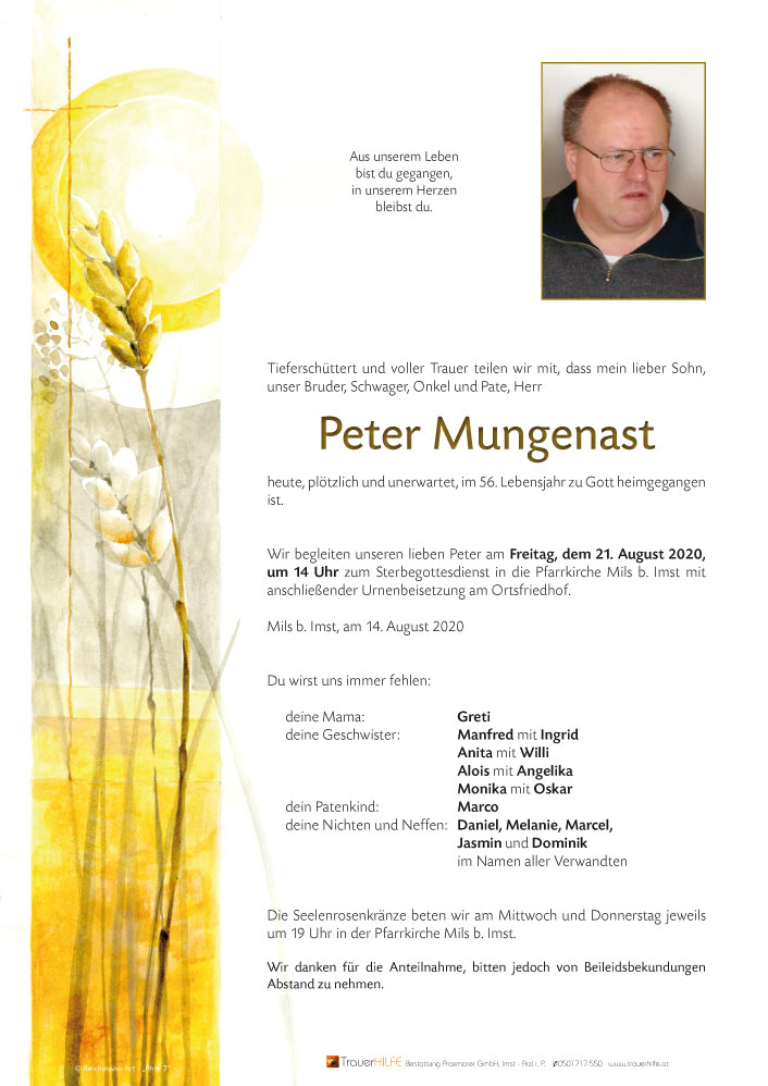 Aufrichtige Anteilnahme am Tod unseres Cousins Peter17.08.2020 19:57 - Gasser Anita mit Fam. , Schrott Hannelore mit Fam.