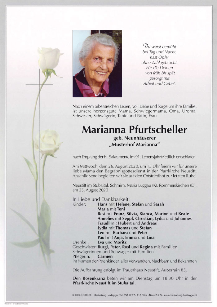 Meine liebe Marianna (meine Zweitmama), nun bist Du gegangen und ich konnte Dich leider nicht mehr sehen, aber es tröstet mich, dass der Liebe Gott, Dir Deinen größten Wunsch erfüllt hat und Du friedlich hast einschlafen dürfen. Im Oktober komme ich wieder, aber Du wirst nimmer da sein, wirst mich nicht mehr freudig begrüßen und in den Arm nehmen... wirst nicht mehr rufen "ja wer kimmt den da" - nun werde ich die Haustüre aufmachen und es wird Stille sein... und es wird schwer für mich sein... Du hast einmal zu mir gesagt ich wäre für Dich wie Dein 9. Kind und liebe Marianna, Du warst für mich auch immer wie eine zweite Mama in all den vielen Jahren... DU, das Stubaital, der Musterhof, die ganze Familie - alles war und ist immer Heimat für mich... aber ohne Dich? Mein Herz ist schwer - und ohne Dich wird es nie wieder so sein wie früher. Ich werde Dich sehr sehr vermissen liebe Mama... vor allem Dein strahlendes Gesicht, wenn ich Dich besuchen kam, Deine herzliche Art und Deine Liebe, die Du mir geschenkt hast - ich möchte Dir danken liebe Mama, denn ich habe mich immer als Teil der Familie gefühlt, das hast Du mich spüren lassen und hast gesagt "für dich Gitti ist immer a Platzl frei". Jetzt Abschied zu nehmen - für immer - fällt mir sehr sehr schwer!!! Ich nehme viele schöne Erinnerungen mit und ich bin dankbar, dass ein so lieber Menschen wie Du, ein Teil meines Lebens war... Ich werde Dich schmerzlich vermissen meine liebe "Mama-Pfurtscheller" - Deine Gitti
