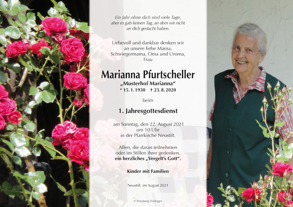 Grias Di Marianna - meine Mama-Pfurscheller. Nun war ich, nach 2,5 Jahren, Ende Juni, endlich wieder in meinem geliebten Stubaital und konnte Dir ein paar Blümchen bringen und a Kerzerl in der Kirche für Dich anzünden. Meinen Besuch am Musterhof habe ich lange hinausgeschoben - aus Angst vor dem Schmerz - Dich dort nicht mehr anzutreffen... ja es tat weh - als ich die Türe öffnete und ins Haus kam war dort nur Stille... keine Mama, die sich freut, mir lächelnd entgegenkommt und mich begrüßt... ich ging in die Stube und setzte mich auf Dein Platzerl - wieder Stille... nur die Uhr mit ihrem Tock-Tock Tock-Tock... da hab ich geweint (so wie jetzt auch während ich Dir schreibe) doch Du liebe Mama-Pfurtscheller hast zu mir gesagt "brauchst nicht weinen Gitti - es ist alles gut - ich bin doch da"... und so wurde aus der Stille eine friedliche Ruhe - auch in meinem Herzen - dort wo Du jetzt bei mir bist... In tiefer Verbundenheit und Dankbarkeit, Deine Gitti