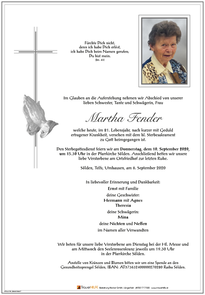 Im Altersheim von Sölden bist Du unserer Mama eine gute Freundin gewesen und hast ihr immer sehr ordnungsgemäß ihre Serviette zusammen gelegt. Oft sind wir zusammen spazieren gegangen und Du hast mir Witze erzählt und hattest immer ein Lachen im Gesicht. Danke Martha für Deine Freundschaft und die netten Gespräche. In meinen Herzen wirst Du einen besonderen Platz einnehmen.
