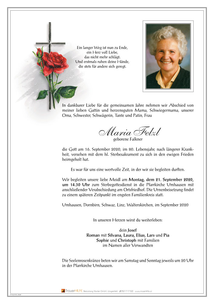 Lieber Sepp, lb. Roman mit Familie aufrichtige Anteilnahme, viel Kraft und Zuversicht wünschen euch von Herzen Leni und Hermann mit Familie18.09.2020 11:00 - Leni Plattner