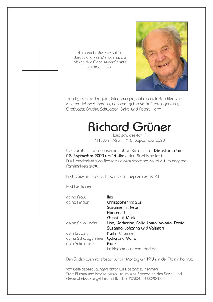 Wir möchten euch allen zum Ableben eures lieben Richard unser aufrichtiges Beileid aussprechen und viel Kraft für die schwere Zeit wünschen.20.09.2020 11:58 - Bair Bernhard & Irene mit Fam.