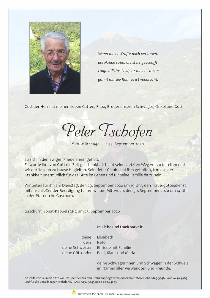 Bestattung wurde durchgeführt von: Peter Marent Bestattung Marent GmbH Gantschierstraße 80 6780 - Schruns Tel.: 05556 77070 zum Bestatter