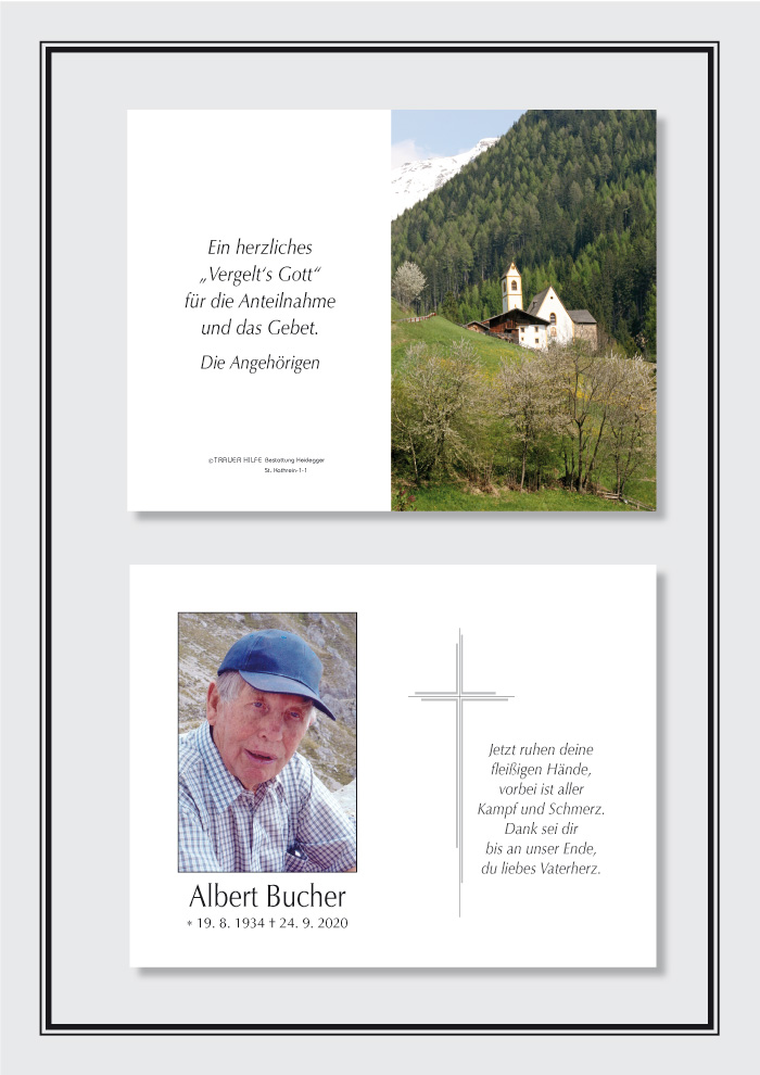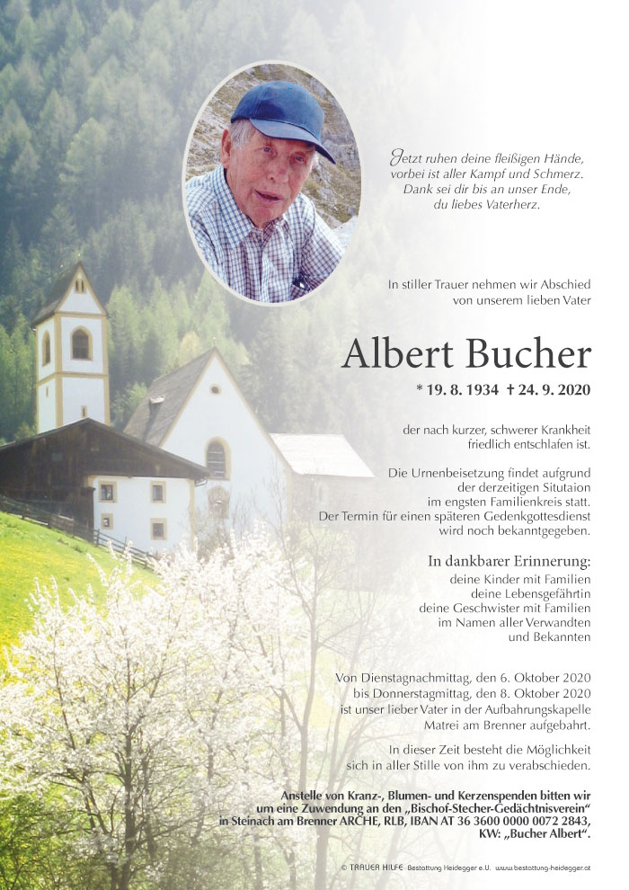 Bestattung wurde durchgeführt von: Karl Neurauter Karl Neurauter Bestattung Heidegger Brennerstraße 69 6150 - Steinach am Brenner Tel.: 05275 5211 zum Bestatter