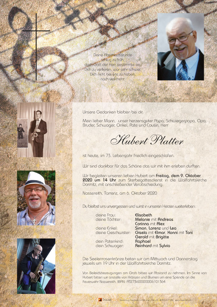 Es wäre schön gewesen, noch ein bißchen zu verweilen, als das Schicksal rief und Hubert musste eilen. Doch wenn auch sein Leib entschwindet, ist es das Herz, das Euch ewig verbindet.